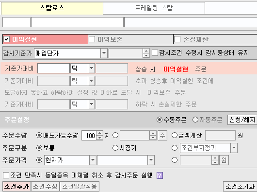 이익실현 - 기준가대비 ~% 상승시 이익실현 주문 - 조건추가 누르면 됩니다.